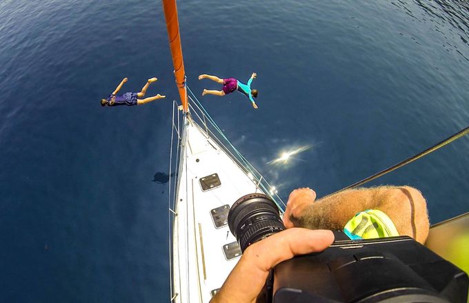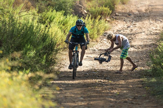 We found ourselves in some crazy filming situations – from hanging out of the back of the van, filming road bikers climbing steep narrow streets in Greece to being hoisted up a yacht mast in 40 degree heat.