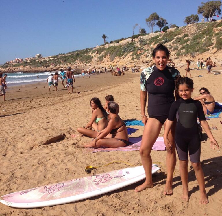 Shiraz Ksaiba waved goodbye to rainy England for a life surfing in Morocco with her seven year old daughter Matilda