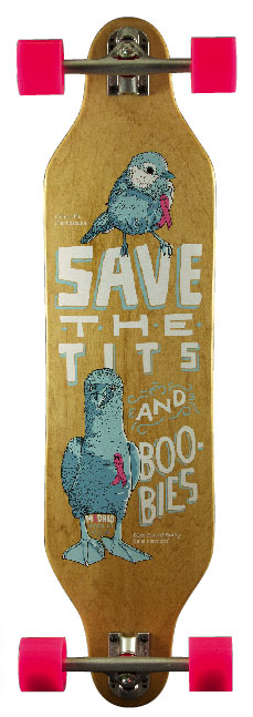 This baby of a longboard isn’t just great because it offers a super smooth cruise around the city, it’s also raising awareness for breast cancer with the signature pink wheels and birds sporting the ribbon. The model is actually the Weezer, with a twin tip shape, Gullwing Charger Trucks and Cadillac 5.0 High Perfomance bearings.