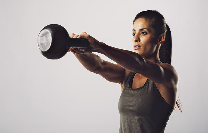 Young fitness female exercise with kettle bell. Mixed race woman doing crossfit workout on grey background. Kettlebell swing.