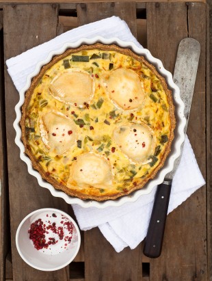 In a large bowl whisk the eggs, crème fraiche, cubes of goats cheese and season with plenty of salt and a little pink pepper. Scatter the leeks into the pastry base, fill with the egg mix and arrange the sliced goats cheese on top.