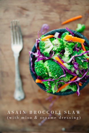 Chop broccoli into florets and blanche for 30 seconds (until bright green and a little tender) and immediately dunk in an ice bath. Combine with carrots and cabbage.