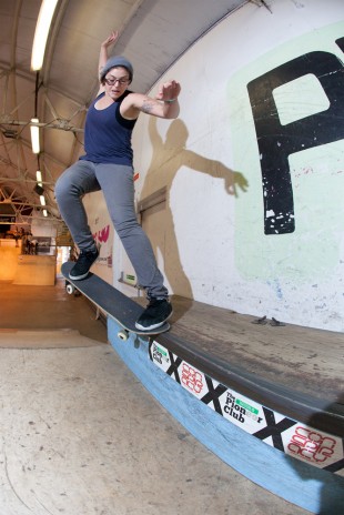 Next up was the Over 18’s. Fran Stroud (who is actually from Stroud!) has recently returned to skating after some time out and instead of diffidently skating around the course she went straight into boardsliding down the rail like she’d not been away. She also flipped the house wedge and up the step up with ease. Hot off her best trick win in Wuppertal and selected female skater to accompany the Pixel You Tour to Gran Caneria, Camilla Mullins was also going all out. She too landed a boardslide down the rail. Other tricks included a sweet front crook on the block and a 50-50 along and down the hubba. “French-but-now-living-in-the-UK” Claire Alleaume run consisted of back tails and back smith on the quatre, a heel flip up the gap and a 50-50 on the block, all of which was enough to secure her first place.