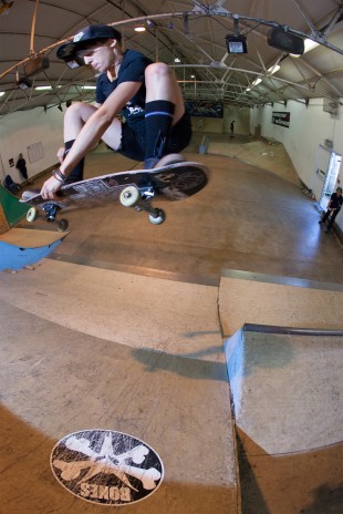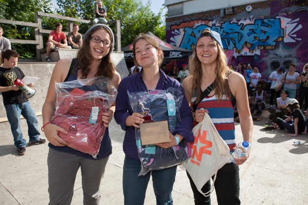 Lastly it was the turn of the sponsored riders. Epic traveller Marie Dabbadie of France landed a nice transfer from quatre to flatbank and also landed a big spin on the bank. Emma Richardson was as solid as ever with a 5-0 on the block and a nollie bigspin on the steep bank. Silvia flew around the course at her usual hectic speed landing a couple of bs disasters along the way. Lucy was her consistent self. Tricks included a fakie lipslide on the rail and fakie flip on the bank. This year though it was the turn of Julia Brueckler to take the title. There had been some difference in opinion about the flat bar rail, whilst Julia wanted to set it too it’s highest point others wanted to keep it set at mid level. Julia conceded and opted to skate other things on the course as she found the rail was a little too low for her. However her tricks still flowed and she landed a 50-50 shuv out on the block, bigspins on various obstacles and a lipslide on the rail.