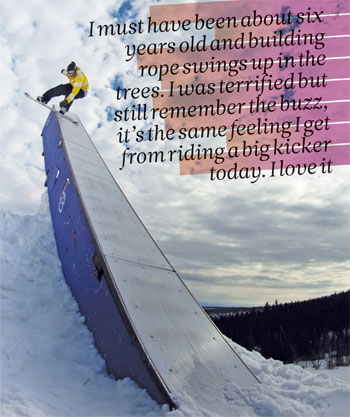 Jenny: I must have been about six years old and I remember building rope swings in the forest with my family, up in the trees. Then I would have to launch off and swing out. I was terrified but I still remember the buzz I got from that. It’s just the same feeling I get from riding a big kicker today. I love it.