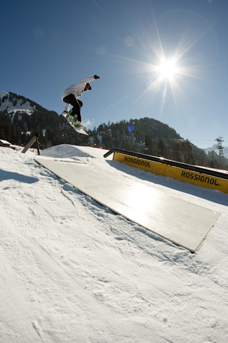 With the sun blazing and beats pumping in the park at the foot of the Kanzelwand, the girls tickle in one after another and start shredding some smooth runs. With course consisting of various pipes to either ride onto or jump, two little corners, down boxes and rails of all heights, lengths and steepness, two smaller and two bigger kickers as well as a pole jam with a disco box underneath, a wallride, a double kinked rail and a step down one, even jib losers like us editorials can have a try at tackling the metal.