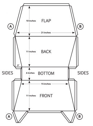 6. On your large sheet of plastic, use a crayon/chalk to mark out the dimensions of the plan featured here. You can now construct your bag as follows: