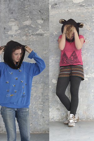 Harri: The rat hood is my favourite! We have a pair of rats that live in the studio and when they come into town with us they sit in a hood and peep out at the outside world.