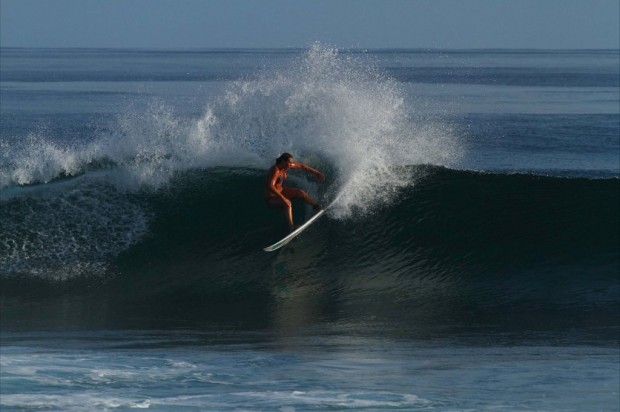 I haven’t been watching the comps. I follow the results of my friends but as for watching one or two foot waves it’s a waste of time. I watch the men’s comps like the one in Fiji… I sit back with a glass of wine because it’s exciting and you can learn from them, I like barrel riding and watching barrels. It’s funny because people say no one watches the girls and I mean, why would they? It’s not exciting at all and being competitive is not ‘feminine’ in the surf industry so they can’t seem to or don’t know how to market the World Title Race. From watching the Nike, ‘Leave a Message’ movie, Carissa [Moore] impresses me. The public don’t get to see the girls’ talent on the tour.