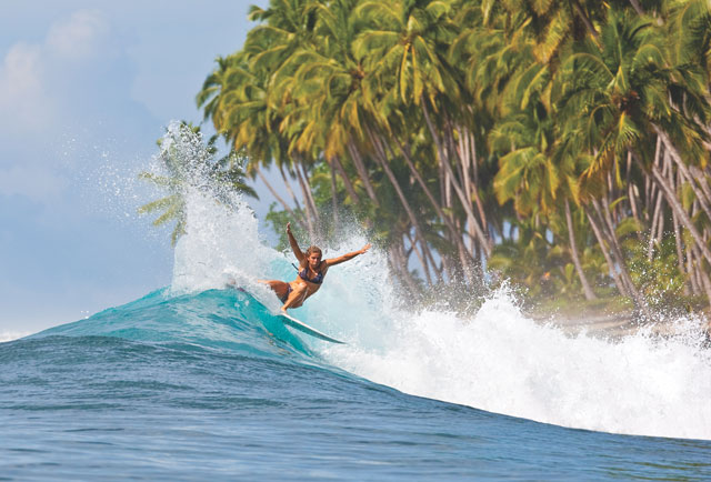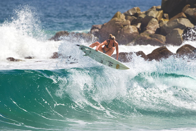 As the lights dim we’re treated to a banger of an opener from Hawaii’s Malia Manuel. Having burst into the surf world three years ago, winning the US Open at just 14, Malia, now 17, is an incredible force in the ocean, powerful and beautiful, her section boasts tube after tube as she charges heavy waves across the world. Next up drops Coco Ho with another run of heavy hitters, aerials and tubes followed by a super fun section from Monyca Byrne-Wickey. Her surfing is perhaps a step behind the rest of the crew but what she’s missing on the waves she makes up for with a healthy dose of butt shots and some gravity defying wrestling. Lakey Peterson follows with a solid section, before golden girl Laura Enever takes to the screen, her impossibly tiny frame charging a succession of meaty faces, emerging from each wave with in infectious cat-that-got-the-cream smile on her face. Her section reeks of genuine passion for surf and leaves the audience grinning from ear to ear. The whoops die down only to start again as Carissa Moore’s section opens with a tow in session that draws a round of applause from the room. The current leader in the race for the ASP Title shows the world why she’s up there at the top, slaying behemoth waves with solid as a rock style right up to the end credits.