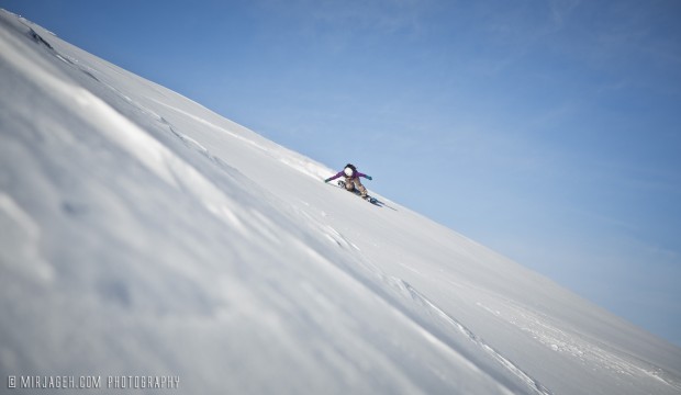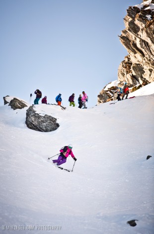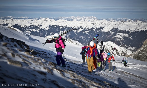 And so, a bit wiser after that last run, I stick to lifts and slopes for the rest of the day and am happily accompanied by more who are saving some energy for the second day. With another bluebird sky and blazing sunshine it’s the perfect set up for some shots by Mirja Geh, who manages to capture each and every one of us live in action. But despite dream weather, breath taking views, memories for a lifetime and photos to share them, charging down in a flock of shred-stoked girls that take over the whole slope has got to be the best feeling of all.