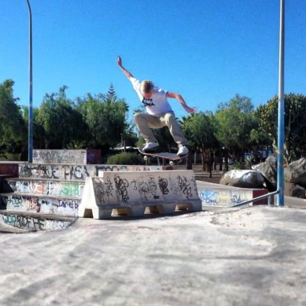 Our apartments were right beside the Maspalomas skatepark – lucky us! This photo was a selfie, taken one morning when I had already been up for hours before anyone else in the crew. I had the park all to myself and mananged to Ollie this jersey barrier before kickflipping it and pop shuving it the next day!