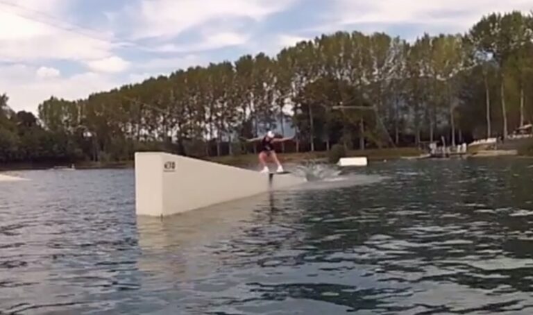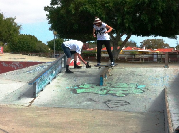 This is Camilla mid filming a rad little line. She put this together in several attempts and then had a well earned Tropical! Boardslide into the bank with Alan our filmer at close range!