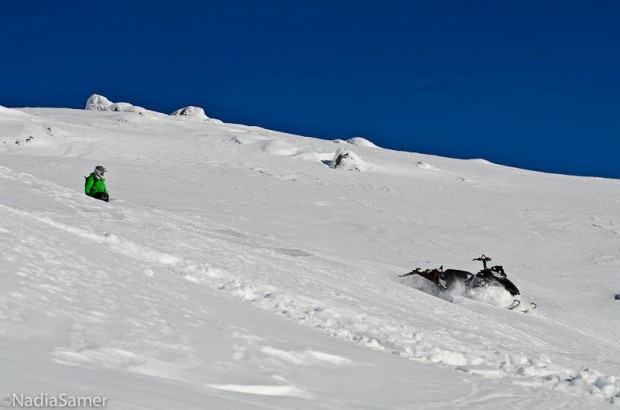Taking a breather… For those who think that snowmobiling is the “easy way” to get yourself riding some lines – try maneuvering around a 250kg vehicle in waist-deep snow. It’s like taking care of 160 horses…