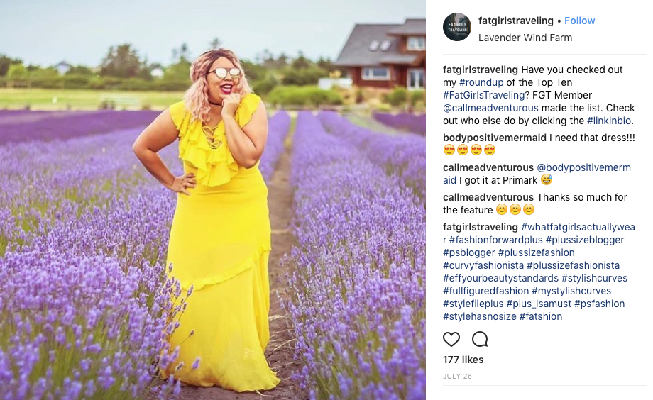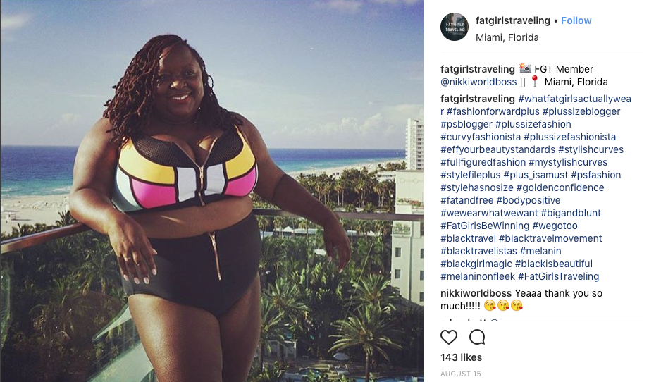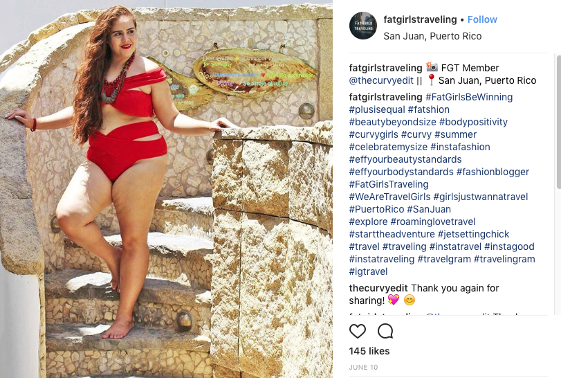 The Instagram Fat Girls Traveling was set up by Californian born stylist Annette Richmond, in response to the lack of promotions and literature in the travel industry that is aimed towards plus size women. The account celebrates and gives a visible platform to larger women, in order to fight back against the current narrow minded dialogue that only features women of a certain size and look.
