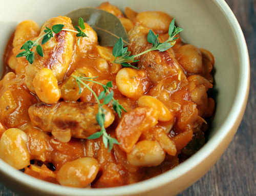 This is a simple version of French Cassoulet, traditionally a way of using up left over meats in a hearty dish with beans and vegetables. Cook this at the weekend when it can sit gently bubbling on the hob all afternoon, then serve up with a green salad and crusty bread or creamy mash and greens.