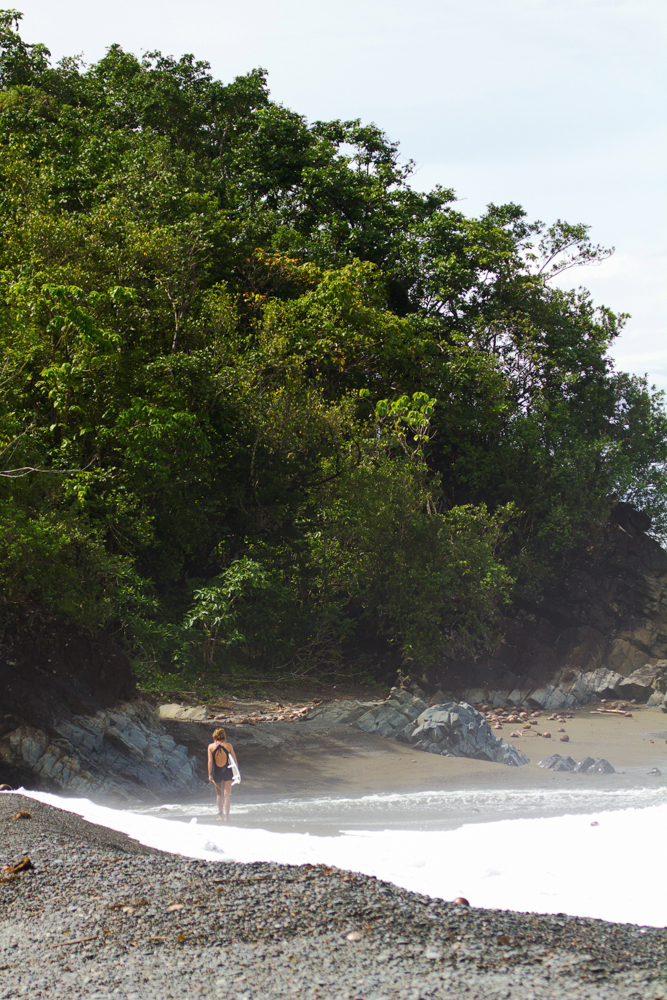 A salty haze fills the morning sky. A smooth ocean surface reflects a pink glow from the few clouds above. A welcome change from the tropical heat as a cool breeze blows out of the jungle, feathering the top of an approaching swell. A light spray throws back in my face, the ocean’s welcome.