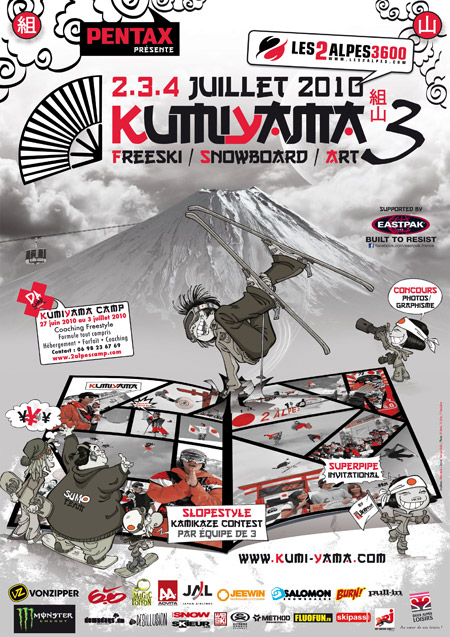 Especially with it’s absolute unique set up: the KUMI YAMA is a slopestyle “Kamikaze” contest where riders compete in teams of 3 and are required to perform choreography as a team! But not on your typical obstacles – most of them will be made up especially for the event: amongst them a XXL Sumo, a sunrise, a Kanon rail, a butter flag, and many more…