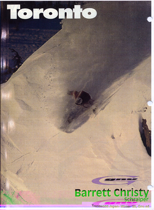 Ha! I didn’t set out to do my own trick, I was trying to do switch rodeo’s at Mt Hood and I guess I wasn’t doing them right. A week later I went to the summer X Games in San Francisco, where they built a giant scaffolding jump for Snowboarding Big Air and it was on snow carpet with some wet snow blown onto it. It was kind of a sketchy jump with a steep run-in and a short landing. I did it there and the announcer didn’t know what it was so he called it the “Barrett Roll”. I guess it stuck!