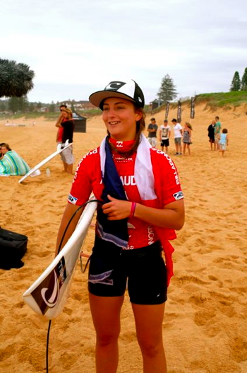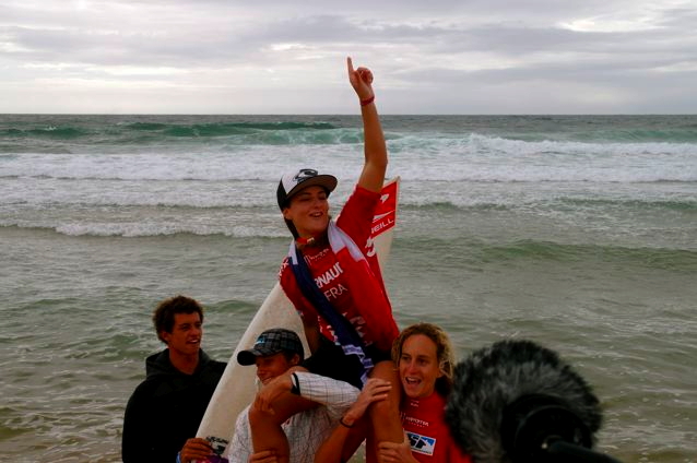 The 20 year old O’Neill rider from Anglet, France was lifted up the beach after her semi final heat, the French flag draped around her shoulders.