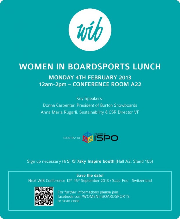 Since so many girls are still asking, here’s a little reminder to come join us at the Women in Boardsports ispo lunch, on Monday, February 4th – careful from 12am -2 pm!