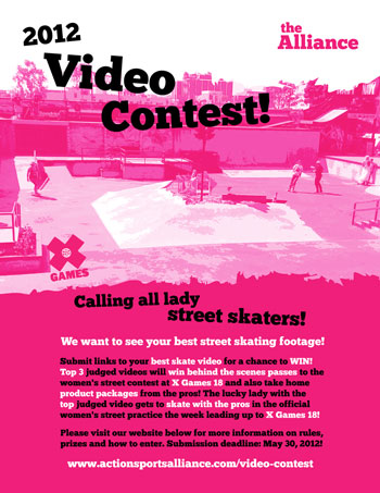 3. The top judged entry will get to skate with the Pros in the Women’s X Games Street practice the week leading up to the contest.
