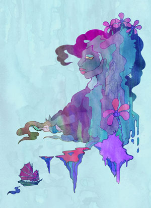 SRI is an artist and illustrator of Eurasian heritage, who grew up in South East Asia and the UK. The experience of this mixed background provides a significant influence in her work. SRI’s inspiration is the synthesis of her exposure to, and interest in diverse cultures, with ideas being generated from an abundant spectrum of visual, mythological and multicultural sources, with a recurrent theme of nature and the elements; portrayal of land, sea, sky, trees, mountains, clouds and flowers underpin this notion. Her work is predominantly characterised by an unusual fusion of fantastical worlds, gentle surrealism and delicate femininity. This is however, anchored with a deeper, more meaningful heartbeat that runs throughout.