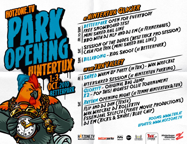 Like every year, it’s the Hintertux glacier in our beloved Zillertal valley that is heralding in the new season on the first weekend of October. With a perfectly shaped Betterpark, pros like Gigi Rüf, Werni Stock, Marco Feichtner, Marko Grilc and many more, a huge test area with all the latest gear for 2010/11 and of course party mayhem par excellence this is a season start you don’t wanna miss.