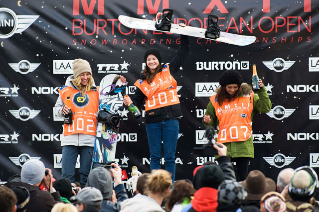 Despite the space shuttle sci-fi theme, the Burton European Open were dominated by veterans of the sports, with pipe legend Kelly Clark (USA) winning the half pipe finals on Saturday followed, after double TTR tour winner Jamie Anderson had already bagged slopestyle two days before. But with a Frontside 9 followed by a Frontside 1080 and Cab 720 Mute, who can beat her anyways? Gretchen Bleiler tried, who isn’t exactly new to the pipe herself, but didn’t come very far either, and had to settle for second. With Yuki Furihata and Cilka Sadar in 3rd and 4th spot, there was at least some future talent riding to the space-theme and Kelly was super stoked anyway: “It was great riding in sunny weather, it lifts the spirits, and the level of riding. All the girls were pushing it and it still remains a challenge even after so many consecutive wins!”