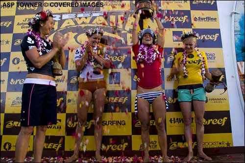 After more than a decade of trying to win the first leg of the Vans Triple Crown of Surfing, Haleiwa’s own Megan Abubo, 29, finally sampled the sweet taste of home-town victory today, winning the $30,000 Reef Hawaiian Pro in front of a hugely adoring local crowd.