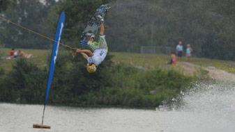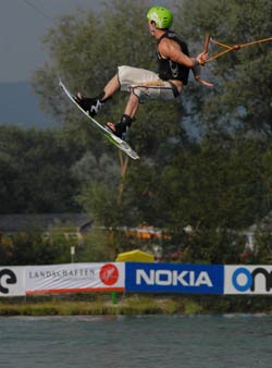 The session was full of surprises as the triple World Champion, Bernhard Hinterberger (GER), had to write off defending his title after a fall at the first trick in the semifinal. However, he did complete the fatest run of the World Championships on the jetlake with a crow mobe in the middle of the lake, followed by double s-bend, pete rose, tweetybird in front of the motor reel, than mobius, transfer over the funbox and a whirly 5 on the kicker. Nevertheless he missed the final, ending up in 8th place in his group.