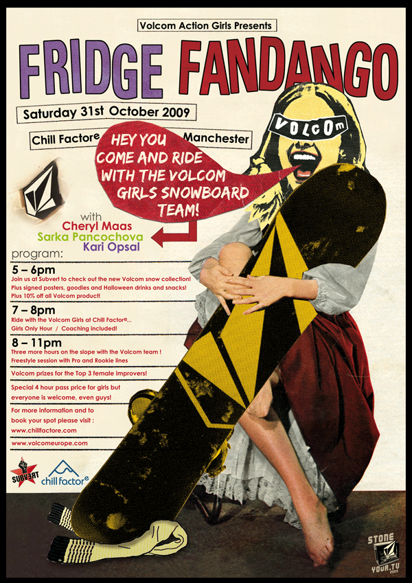 Considered by many as the most progressive female snowboarder in Europe, Dutch rider Cheryl Maas, 24, was voted best European freestyler by Method and MBM magazine for three consecutive years. Sponsored by Volcom, Cheryl has recently been joined on the team by Norwegian snowboarder Kari Opsal, 18, just back from injury, as well as Volcom’s latest signing, Czech snowboarder Sarka Pancochova. Sarka, also 18, has already been hailed as the best overall female rider in the world by Snowboarder magazine in the US, and girls visiting our “Fringe Fandango” will have the opportunity to meet her on her first tour with the Volcom girls’ team.