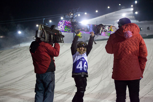 Anyone who’s ever stacked it on an icy jump by day can probably imagine the fairly terrifying prospect of slamming chin first into the frozen floor by night. Yet our brave warriors including 14 year old UK rider Katie Ormerod and former cover girls Aimee Fuller, Cheryl Maas, Kjersti Buaas and our current cover girl Jamie Anderson, plus recent Pro Chat star Sina Canadrian cruised through the daytime qualifying and soon found themselves facing three floodlit runs each in front of a crowd of 1000 woop merchants.