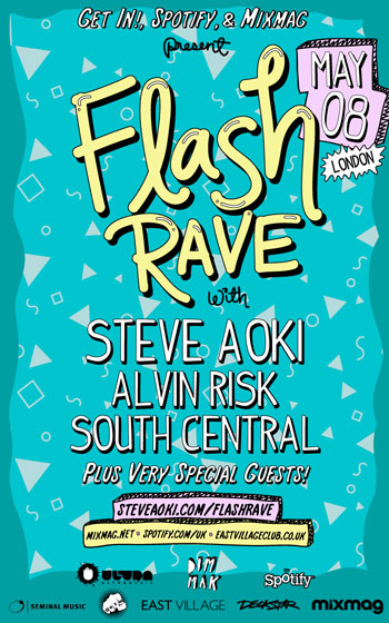As GET IN!, Mixmag and Spotify are hosting a flash rave in the heart of London’s East End on Tuesday 8th May 2012 in the East Village! But since all good things have a catch, tickets are only available through luck, by entering your email address on steveaoki.com/flashrave
