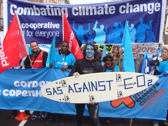 Surfers Against Sewage (SAS) campaigners and volunteers led the march of 50,000 people marching against climate change at Stop Climate Chaos’ The Wave march on the 5th of December. Marching around the streets of London, The Wave had an estimated 50,000 people calling for strong climate change commitments from world leaders at the UN Climate summit in Copenhagen that starts today.