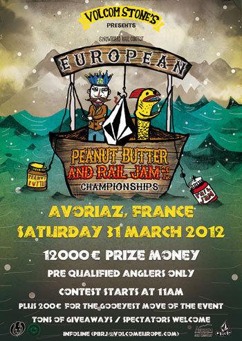 The Volcom Peanut Butter & Rail Jam vessel is slowly but surely piloting towards Avoriaz in the French Alps to anchor for the this year’s PBRJ Final on March 31st 2012, but since only pre-qualified anglers are allowed on board, you better to hurry to catch one of their last qualifier tour spots to bag yourself a spot in the contest (the top 5 in every division at each stop qualify for the finals).