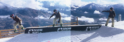 ‘Boxes and rails are total fun but you need to remember our mantra here at Snowpark NZ – “speed is your friend, look to the end”,’ laughs Duncan. ‘The other important thing to remember is to keep a flat base all the way along. Whether the rail or box is on an angle or flat, your board needs to be flat. Be sure to blunt edges so that you don’t take a slam too.’