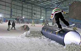 With everyone now getting the feel for the slope, the A-frame and the big gas-pipe seemed like the run of choice. Sarah Morgan led the way with the nicest frontside-boardslides seen in a long while (sick enough to eventually win her the over-all title of Gnarliest Chicken!). A special mention must go out to a girl named Niki who was doing back and front-flips off the Grad Prix kicker. After landing several to a big cheer from the crowd, she landed on her back and was taken to hospital with a suspected breakage. We wish you all the best Niki, swift recovery.