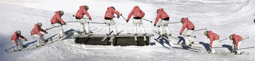 Approach the box straight on and pop up on to the c-box. Land with your feet directly over the box and your skis at 90 degrees. Lean your body a little into the curve. Now it’s all about the monkey stone again: your knees, upper body and hips are bent and your arms should be in front of the body pointing to the ground. In this position and with the right speed, you’ll reach the end of the box smoothly.
