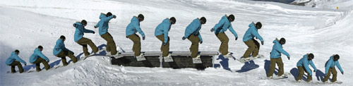 Once you have the right balance in the slide, the end of the box will appear very quickly. As soon as you lose the box under your feet, get your board straight again so you don’t catch your edge in the snow. If you do a proper square board slide, it will be easiest for you to land this trick fakie – you already bring some kind of spinning motion with you from the take off, so keep this momentum and go to fakie on the end of the box. To do this properly, you need to turn your shoulders in the new direction and your body and board will follow. When you land, bend your knees again, look forward and concentrate to keep going straight. Ride out switch and smile. Well done. You just did your first backside board slide.