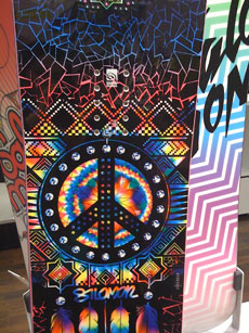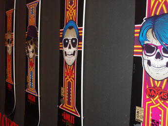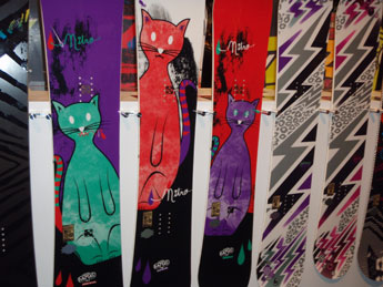 Nitro Cheryl Maas pro model boards: See no evil, hear no evil, speak no evil cats. / Guns ‘n’ Roses pro model boards, with Cheryl’s far right.