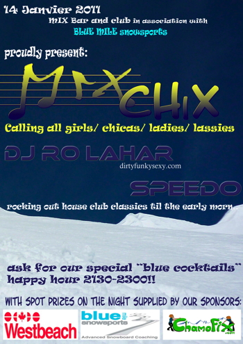 If you’re around Chamonix this Friday, January 14th, make sure you join us in the Mix Bar for the MIX CHIX Night with Blue Mile Snowsports!