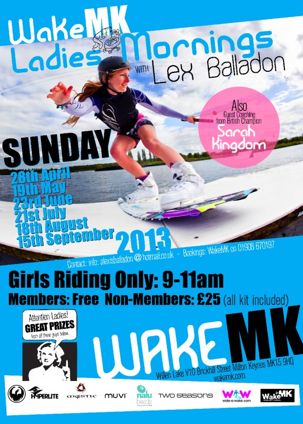 You’d like to get your wakeboarding going again but need some motivation / tips / moral support? Then this series of events hosted by UK’s Lex Balladon is what you were looking for: Ladies Mornings girls only riding sessions at Willen Lake in Milton Keynes once a month, starting this Saturday, April 28th 2013! Open for all abilities & levels, with or without kit.