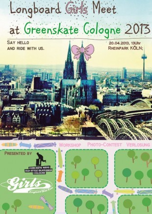 With female longboarding taking off like a very elegant and graceful rocket ship these days, the Longboard Girls Crew is super busy organising get togethers for longboard loving girls all over the world. After a big meet in Argentina in Spring (stay tuned for some highlights coming soon), they’re travelling on to the Greenskate in Cologne, Germany this Saturday, April 2oth 2013, for a Girls Meet at 2pm (wrong time on flyer!) including some workshops and a little photo contest before the regular event, that will kick off two hours later.