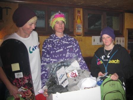 Anais, from Villars and sponsored by Nitro Static won the comp. She also won the Grimentz comp a few weeks ago, so she is becoming an experienced prize collector! Laura Berry, sponsored by Red Bull, came 2nd with her frontside 360 over the 1st kicker and a backside 360 over the 2nd. In the 2nd half of the comp she nailed a front-side board pretzel, and then the rainbow rail, a tail-tap backside 180 and finishing up with something fancy on the last rail.