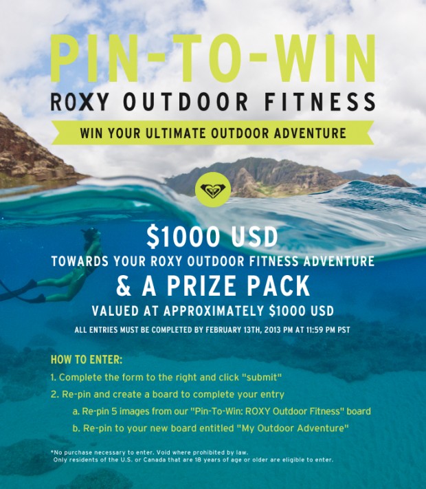 Pin your Ultimate Outdoor Fitness Adventure for a chance to WIN a $1000 USD Outdoor Fitness Prize pack and $1000 USD cash prize to start living your Roxy Outdoor Fitness Adventure.