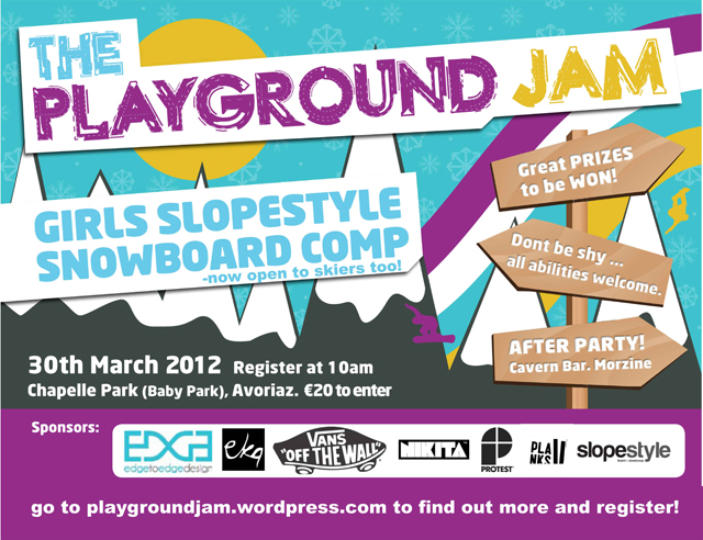 The girls’ slopestyle comp (now open to skiers as well as snowboarders) takes place on 30th March at the Baby Park (Chapelle) in Avoriaz and is open to all abilities so don’t be shy get your entry in now at playgroundjam.wordpress.com and a bunch of super cool prizes from the likes of Vans, Nikita, Protest, Planks and Ekawear could be yours. Oh yes yes yes.