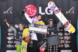 Unlike previous editions of the Freeze, where torrential rain, gusts and gales were the order of the day, Mother Nature had other, more rad ideas in store, surely knowing that not only was the Freeze going down, but the premiere of the almighty “5 More Minutes…Please?!”was also in town, and duly obliged with blazing sun and only a few splatters of token Freeze raindrops.  Although Freeze is strictly a competition for the dudes, it’s irrelevant.  The riders threw it down, with our brother magazine Whitelines’ Battle of Britain showdown on Friday amongst the cream of UK snowboarders  leaving jaws dropping at the standard of shred the UK has produced.  Billy Morgan’s super steezy, more laid-back-than-Luda-‘s double backflips were the crowd pleaser of the day, claiming top spot, and a face full of champagne.  The World Cup clash on the second sundrenched and (slightly hungover day) drew a crowd of 17,000 (or so the super-amped commentators were telling us), and riders including winner Janne Korpi and UK favourite Jamie Nicholls double corked their way to the top of the rankings.