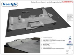 Down to the South of the City, the old steel ramps which have adorned the Clapham landscape for several years now are currently being torn down to be replaced by a new concrete plaza with a tarmac surround. Lucy – The site was rather large, and actually too big for it to be entirely concrete with the given budget. With this in mind, we designed the park to be a circa 500m2 float finish concrete park surrounding by tarmac (a high standard spec) with features including ledges and rails which will enable you to skate the perimeter. Within the concrete park, there are your popular features including a miniramp, driveway, hip, and flat banks. More innovative features include a set of steps, which can be skated in the traditional way or skated off the side. There is also a curved ledge on a taco shaped bank, an ‘MJ’ block and whippy quarter with pool coping.