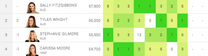 And the defending champion Carissa Moore is in 4th on 54,700 points.